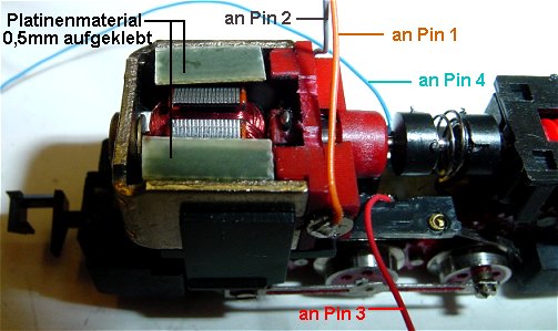 Motor ist wieder eingesetzt. Auf die beiden Magnete des Motors wird je ein Plättchen aufgeklebt. Hier im Bild aus 0,5 mm