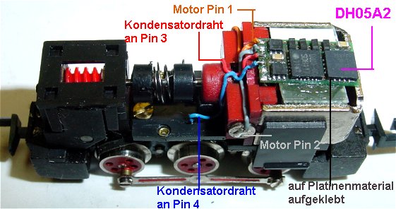 Decoder DH05A2 aufgeklebt. Quer passt der Decoder nicht wegen der leichten Dachrundung des Gehäuses. Im Gehäuse wird die