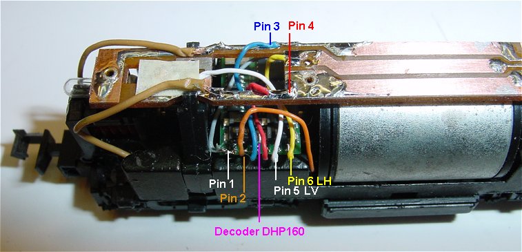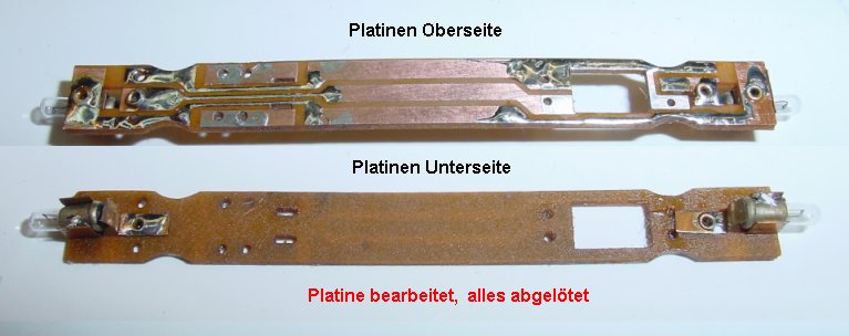 Decoder verdrahtet. Dazu wurden soweit als möglich die vorhandenen Leiterbahnen benutzt, mittlere Leiterbahn für Licht hinten.