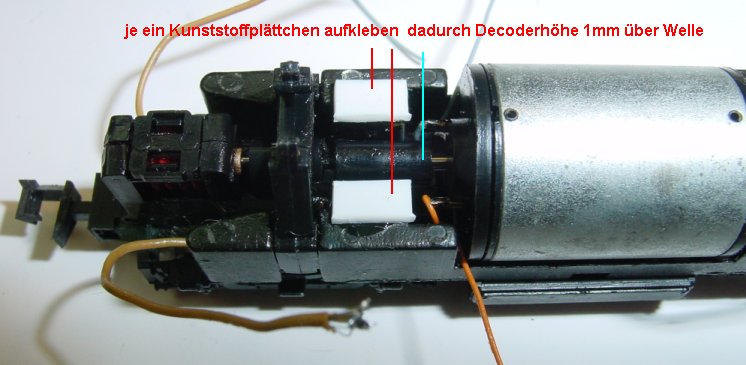 Zwei Plättchen aus 1mm dicken Polysterol sind auf den Motorblock aufgeklebt. Dadurch liegt der Decoder 0,8mm über der Kardanwelle.