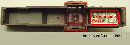 Im kurzen Vorbau wird innen oben 1/2 mm flächig abgefräst. Dies muss sein, weil sonst der Decoder beim Aufsetzen des Gehäuses
