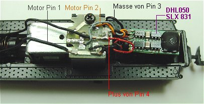 Der Decoder DHL050 ist eingelötet Das graue Kabel von Pin 1 wird an die Motorzuleitung unten angelötet. Orange von Pin 2 an