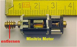 Der Minitrixmotor, von dem nur die Schnecke entfernt werden muss. Der Motor passt ansonsten ideal in die vorhandene