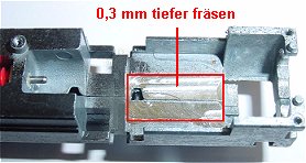 wird. Unter dem Motor muss 1/2 mm Material weggefräst werden, ebenso müssen die Seitenwände am Ende gerade gefräst werden.