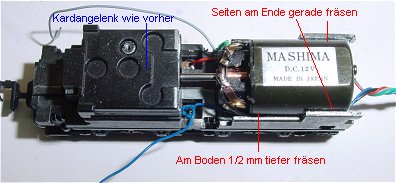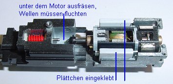Der Motor wird leicht schräg (1/2 mm hinten höher) nach vorn geneigt eingeklebt. Die Kohlenbleche lassen sich auch so zum