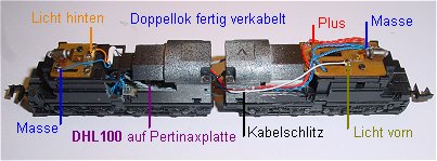 direkt nach hinten heraus zur Lok 2 verlegt. Plus und Minuslitzen werden seitlich in einem Schlitz verlegt (siehe letztes Bild).