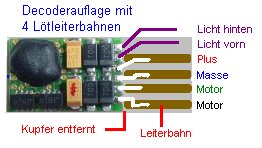 Darauf wird der Decoder geklebt. Der Kupferteil hat 4 Lötbahnen, die Lichtkabel werden direkt angelötet.