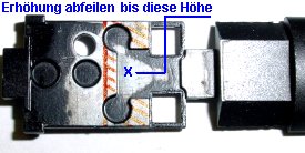 mehr gebraucht. Wie im Bild links die Breite des Decoders anzeichnen. Abfeilen nur bis auf die schwarze Farbe ca. 1,5 mm tiefer.