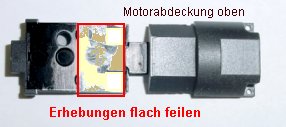 Nochmals zur Ansicht, die rot schraffierten Teile werden abgefeilt, so das der Decoder quer hineinpasst. Da das Material