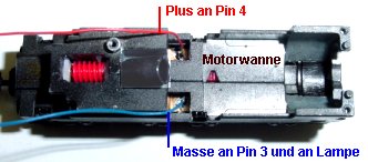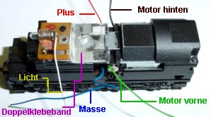 An die Kohlehalter des Motors wird je eine grüne Litze vorn und eine schwarze Litze hinten angelötet. (bezieht sich immer