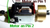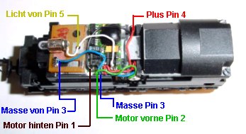 vom Motor hinten angelötet. Die grüne Litze vom Motor vorn kommt an Pin 2. An Pin 3 wird das blau Kabel von den Radschleifern