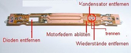 ablöten, ebenfalls die Motorfedern. Leiterbahn zur Lampe (im Bild rechts) trennen. Zur Lampe hinten an Leiterbahn eine Brücke