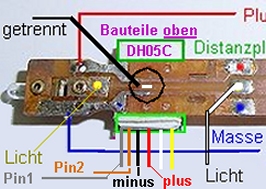 noch eine Litze an F1 und F2 auf der Rückseite des Decoders angelötet werden die dann zu der LEDs Führt.