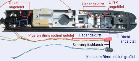 Alternativ kann man die Originalbirnen durch zwei ohne Fassung, mit Litzen, z.B. Viessmann, ersetzen. Dann brauchen die Löcher