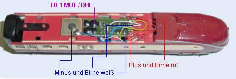 Umbauanleitung: Es wird ein Schaltdecoder gebraucht, hier SD1 von MüT, zur Steuerung des Lichtwechsels am Endwagen.