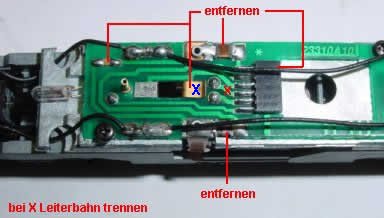 Das Kontaktblech Ober- Unterleitung entfernen. An Pin 4, gezählt von oben (Im Bild links bei X), die Leiterbahn mit