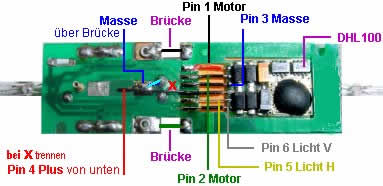Decoderdrähte direkt auf die Platinen Leiterbahnen gelötet. Auf diese Art passt der Decoder in den dafür vorgesehenen