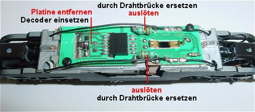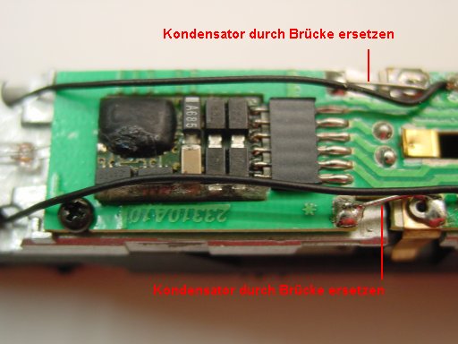 Umbauanleitung: DHL 100/161 auf der PlatineGehäuse durch Spreizen der Seiten nach oben abnehmen. Beide Kondensatoren durch Drahtbrücken ersetzen. Analogplatine entfernen. DHL 100 / 161 eingeschoben. Drahtbrücken eingelötet. Wenn die Decoderpins keinen richtigen Kontakt bekommen lötet man die Stifte des Analogsteckers ab und an den Decoder wieder an.