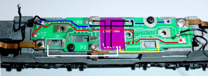 Leider habe ich vergessen ein Foto mit eingelötetem Decoder zu machen. Daher hier die Verkabelung eingezeichnet. Decoder