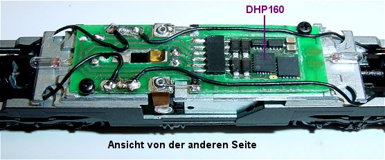 Umbauanleitung: Es passt ein Selectrix DHP 160Gehäuse seitlich spreizen und abnehmen. Beide viereckigen Drosseln auslöten. Analogplatine entfernen. Blechlasche recht entfernen, links muss bleiben. Kondensator im Bild unten rechts auslöten. Zwei Drahtbrücken anstelle der Drosseln einlöten. Decoder mit Tesaband zur Isolation auf der Unterseite in die Schnittstelle einstecken. Copyright Hinweis
