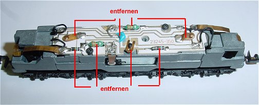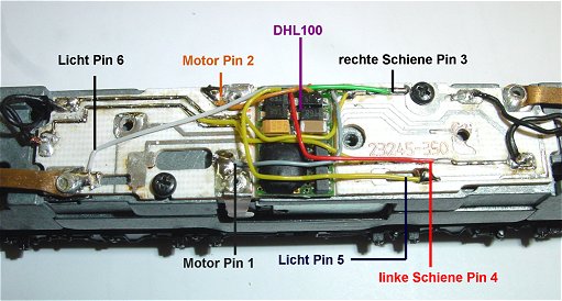 Der Decoder wird in die gefräste Vertiefung eingeklebt. Pin 1 grau an Motorfeder unten im Bild. Pin 2 orange an