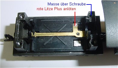 An der Messingzunge wird eine rote Litze Plus angelötet. Die Ansenkung des Schraubenloches oben rechts wird mit einem