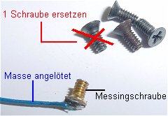 Eine der Eisenschrauben wird durch eine Messingschraube ersetzt, damit man neben dem Schraubenschlitz oben eine blaue Litze