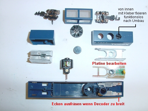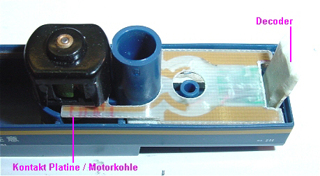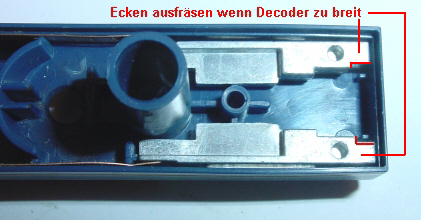 Hinten wird aus der Platine ein Stück wie im Bild herausgeschnitten so das der Decoder senkrecht hineinpasst.