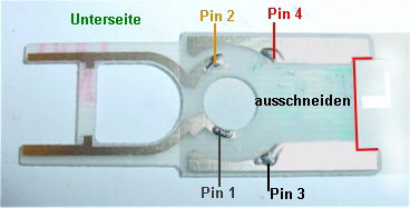 Die vier Anschlüsse werden wie im Bild angelötet, Pin 1 grau.