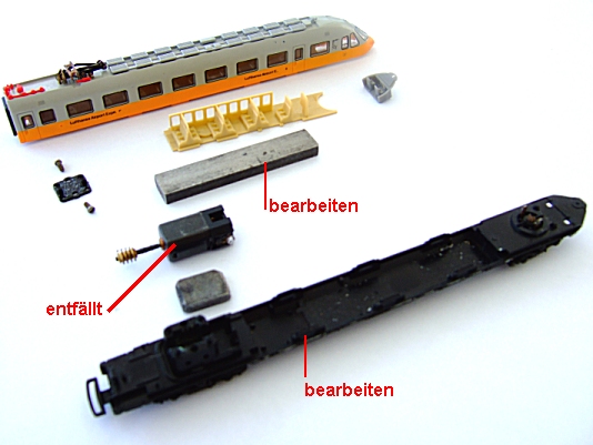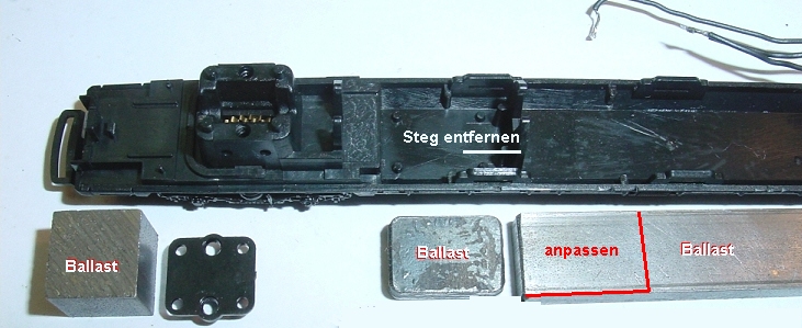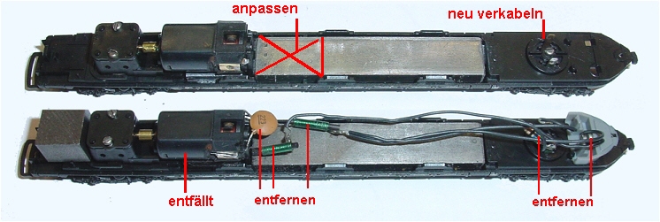 Vom Motor den Kondensator sowie die beiden Drosseln ablöten. Stromabnahme vorderes Drehgestell