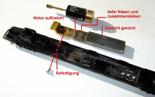 Das Gewicht wird aufgeschraubt und dann der Motor aufgeklebt.