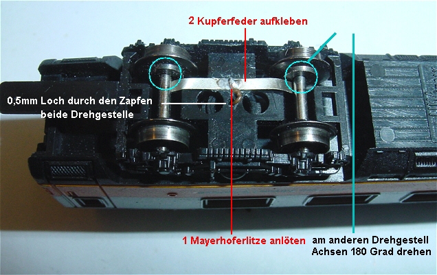 bekommt eine Litze angelötet. Die Achsen werden herausgenommen und die Feder wie im Bild aufgeklebt.