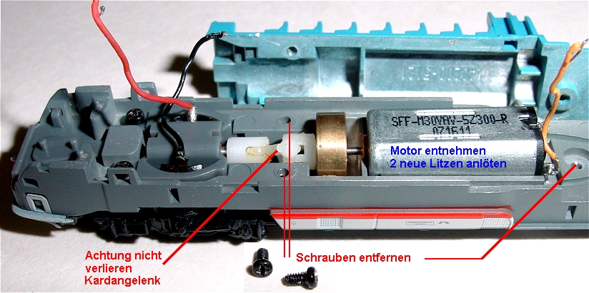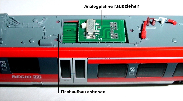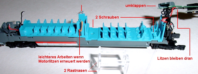 Triebwagen in der Mitte trennen. Vom linken Teil das Gehäuse seitlich spreizen und abheben.