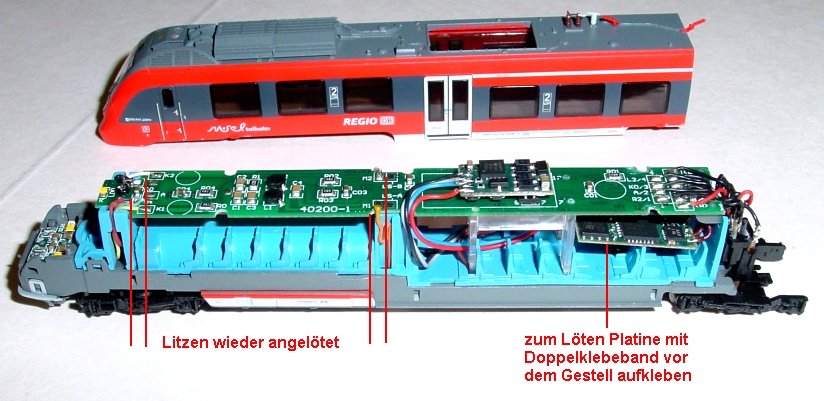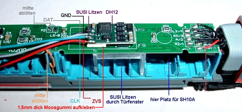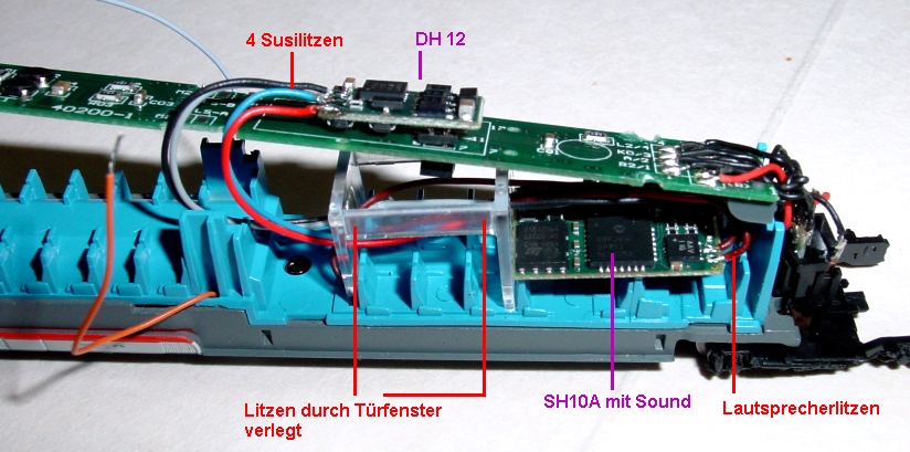 DH12 eingesteckt und SUSI - Litzen angelötet. Nun wird der Triebwagen zum Teil zerlegt um den LS einzubauen.