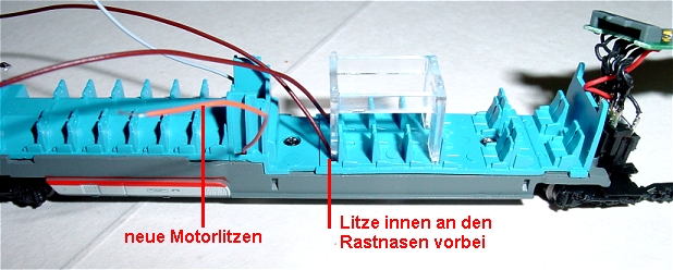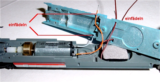 von Stromabnehmer und Motoranschluss wieder anlöten. Nun schauen die Susi-Litzen und beide LS Litzen vorne heraus. Der SH10A wird vor