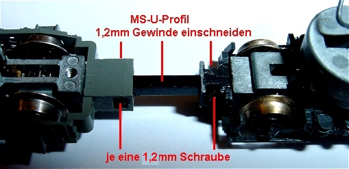 Die Verbindung der beiden Loks erfolgt durch ein MS- U - Profil. An beiden Enden wird ein 1,2mm Gewinde eingebracht und nach Einstecken