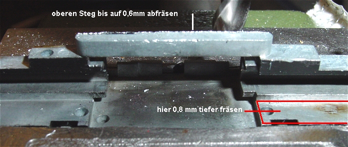 Der obere Steg wird bis auf 0,8 mm abgefräst, das ist ca. die Dicke der verbleibenden Platine. Auch im Bild unten