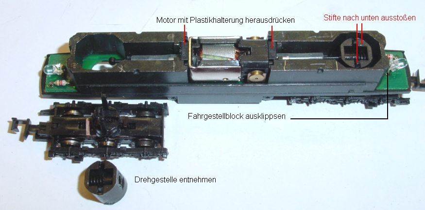 Gehäuse ist abgenommen. Um nun oben fräsen zu können werden beide Drehgestelle entfernt. Dazu werden beide Rastnasen