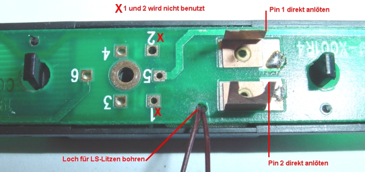 Noch einmal etwas größer, gut zu sehen das 1,5 mm Loch welches für die Lautsprecherlitzen gebohrt werden muss. Achtung, nicht in eine der