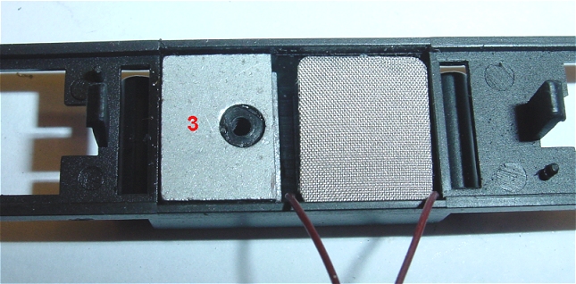 Unten ist der LS bereits eingeklebt und die beiden Litzen werden später durch das Loch in Bild 4 seitlich am Motor vorbei nach oben verlegt.