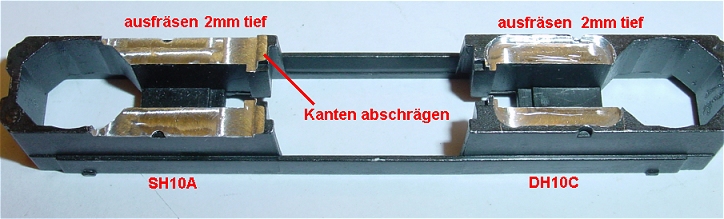 Nun wird Motor von unten herausgedrückt und der Platz für den SH10A links und den DH10C rechts angezeichnet und ausgefräst. Die Tiefe ca. 1,8mm.
