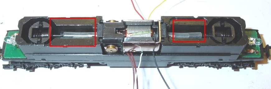 Drehgestelle wieder eingebaut. Motoranschlüsse sitzen in den Federn. An den überstehenden Federteilen wird später die Litze orange und grau