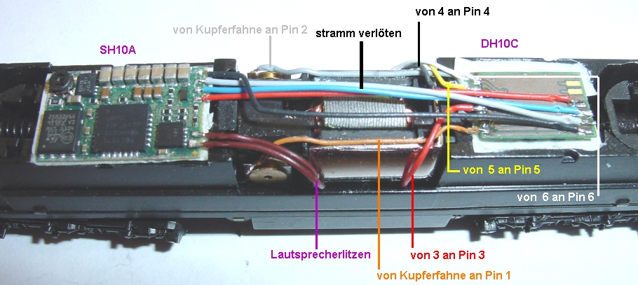 Hier die Verdrahtung: Links der SH10A mit den beiden LS-Litzen sowie den 4 Susilitzen zum DH10C welcher rechts aufgeklebt ist. Am DH10C ist Pin 1
