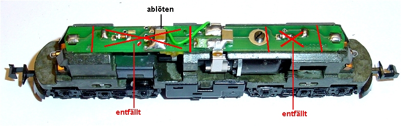 die Trix dankenswerterweise diesem Modell für bessere Masseübertragung spendiert hat. Litze ablöten, dann die Motorhalteklammern und das