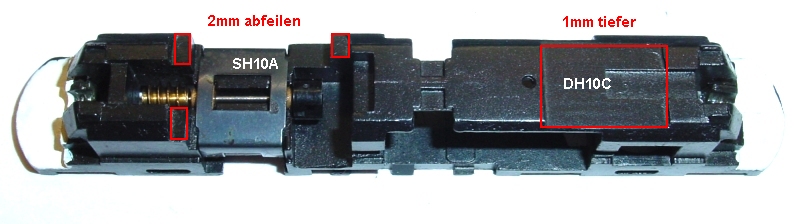 Hier ist der Platz für DH10C sowie SH10A markiert. Da es im Gehäuse sehr eng zugeht muss leider etwas gefeilt ( gefräst ) werden um die beiden