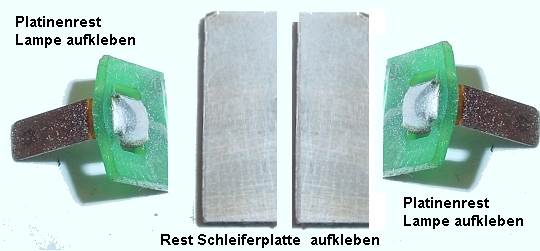 Die übrig gebliebenen Lampenfedern mit Platinenrest. Diese werden mit Sekundenkleber auf den Block aufgeklebt.