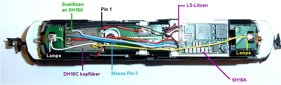 Platinen unterzubringen. Der DH10C baut auch etwas höher als normal da hier auf der kopfüber eingeklebten Platine die Susilitzen oben angelötet