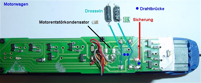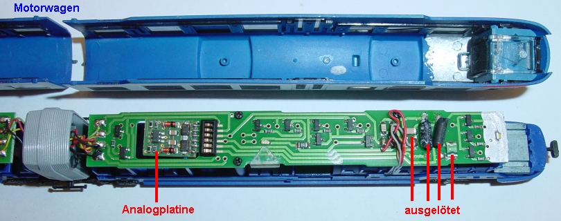 Hier der Motorwagen mit Schnittstelle. Aus Erfahrung habe ich die drei bezeichneten Teile ausgelötet. Je nach Decoder und Zentrale ist