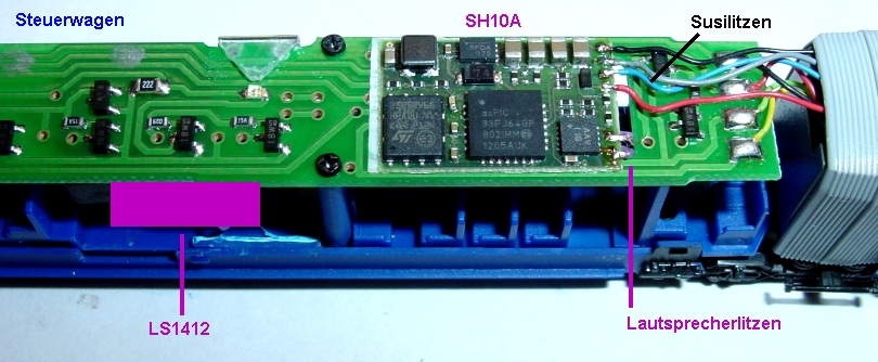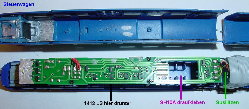 Der Steuerwagen. Hier wird der SH10A auf den Ausschnitt geklebt und der Lautsprecher mittig unter die Platine.