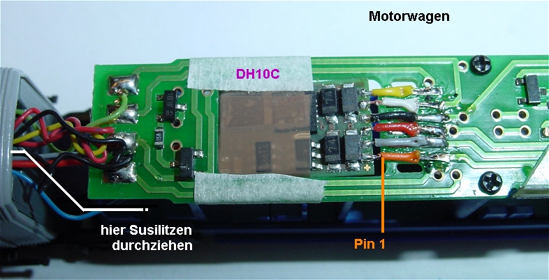 Der Motorwagen mit Susilitzen links, rechts die 6 Decoderlitzen welche an die Schnittstelle gelötet sind.